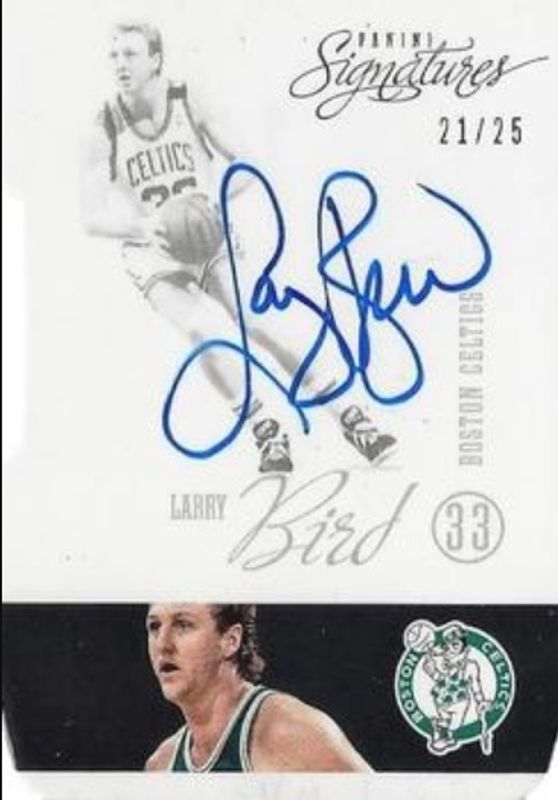 The Larry Bird 2012 Panini Signatures #147 Signatures die-cut /15 card is 1 of 42 Larry Bird's card variations in the 2012 Panini Signatures set being tracked by Sports Card Investor, including Signatures Die-Cut Green, Signatures Die-Cut Platinum, Signatures Die-Cut Red, Signatures Film Green, and Signatures Film Red.