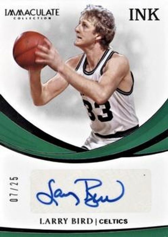 The Larry Bird 2018 Immaculate #IK-LBD Immaculate Ink /99 card is 1 of 19 Larry Bird's card variations in the 2018 Immaculate set being tracked by Sports Card Investor, including Premium Patch Autographs (/15), Premium Patch Autographs - Gold (/5), Premium Patch Autographs - Red (/10), Immaculate Inductions /99, and Marks of Greatness /99.
