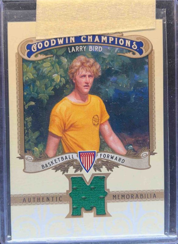 The Larry Bird 2012 Upper Deck Goodwin Champions #M-LB Memorabilia card is 1 of 12 Larry Bird's card variations in the 2012 Upper Deck Goodwin Champions set being tracked by Sports Card Investor, including Base, Mini, Mini Foil, Mini Green, and Mini Green Blank Backs.