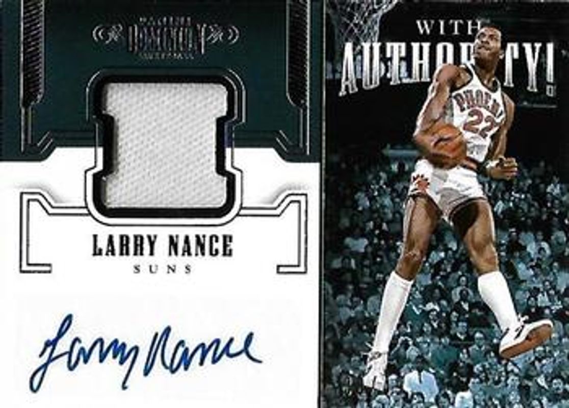 The Larry Nance 2017 Dominion #WA-LNC With Authority! Jersey Autos /49 card is 1 of 6 Larry Nance's card variations in the 2017 Dominion set being tracked by Sports Card Investor, including Main Exhibit Autographs /49, Main Exhibit Autographs - Bronze /25, Main Exhibit Autographs - Gold /10, With Authority! Jersey Autos - Prime /10, and Main Exhibit Autographs - Platinum /1.