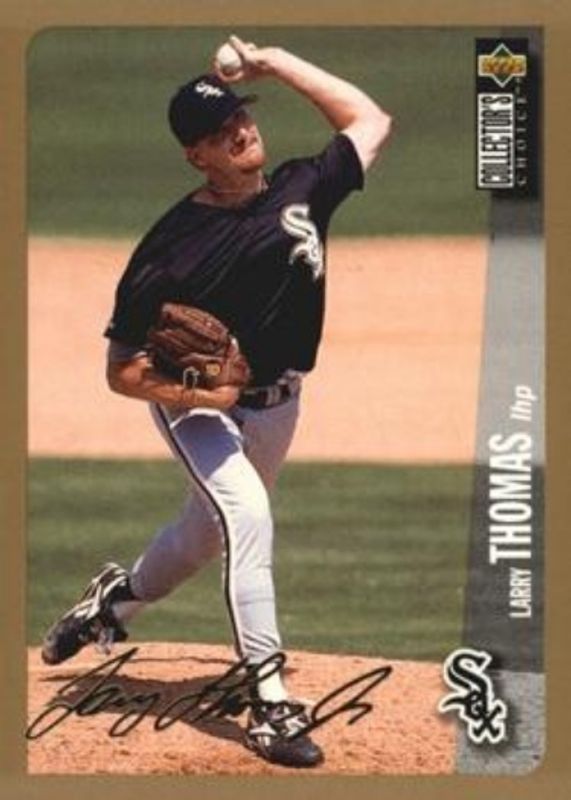 The Larry Thomas 1996 Upper Deck Collector's Choice #512 Gold Signatures card is 1 of 3 Larry Thomas' card variations in the 1996 Upper Deck Collector's Choice set being tracked by Sports Card Investor, including Base, and Silver Signatures.