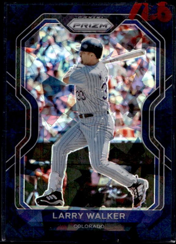 The Larry Walker 2021 Prizm #69 Navy Blue Cracked Ice /25 card is 1 of 43 Larry Walker's card variations in the 2021 Prizm set being tracked by Sports Card Investor, including Base, Blue, Blue Velocity, Carolina Blue, and Cosmic Haze.