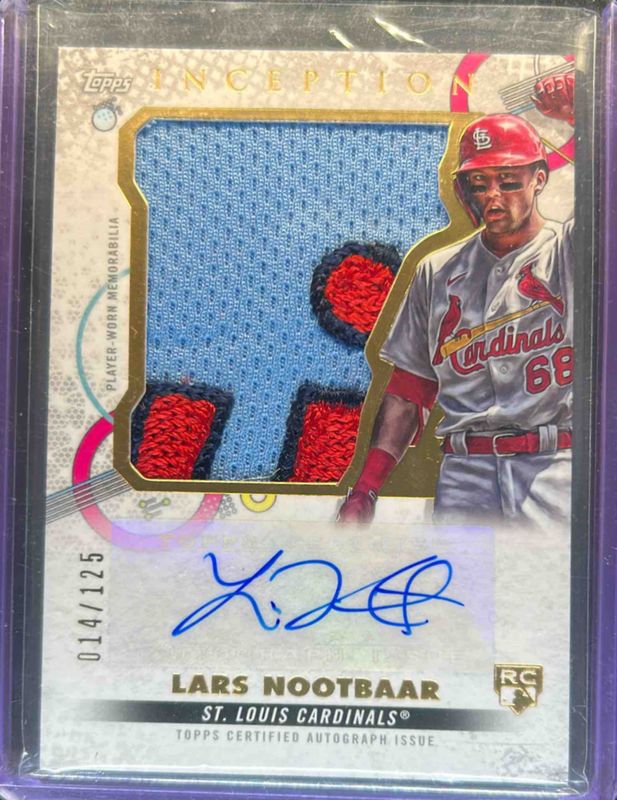 The Lars Nootbaar 2022 Topps Inception #IAJP-LNO Autographs Jumbo - Patch /125 Rookie card is 1 of 29 Lars Nootbaar's card variations in the 2022 Topps Inception set being tracked by Sports Card Investor, including Rookie & Emerging Stars Autographs /299, Autographs - Patch /249, Rookie & Emerging Stars Autographs - Green /125, Autographs Patch - Green /99, and Rookie & Emerging Stars Autographs - Magenta /99.