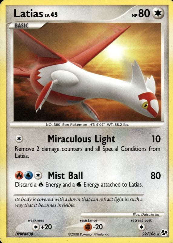 The Latias 2008 Diamond & Pearl: Great Encounters #022/106 Base card in Raw TCG (Near Mint) condition has moved down -$4.57 (-69.6%) in the last 30 days and was last sold for $2.00 .