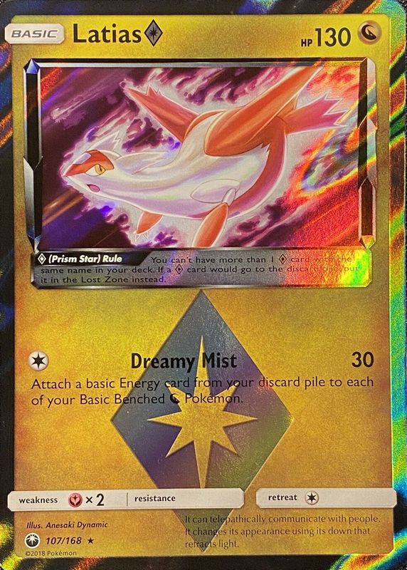 The Latias Prism Star 2018 Sun & Moon: Celestial Storm #107/168 Holo card in Raw TCG (Near Mint) condition has moved down -$0.73 (-7.5%) in the last 30 days and was last sold for $9.00 .