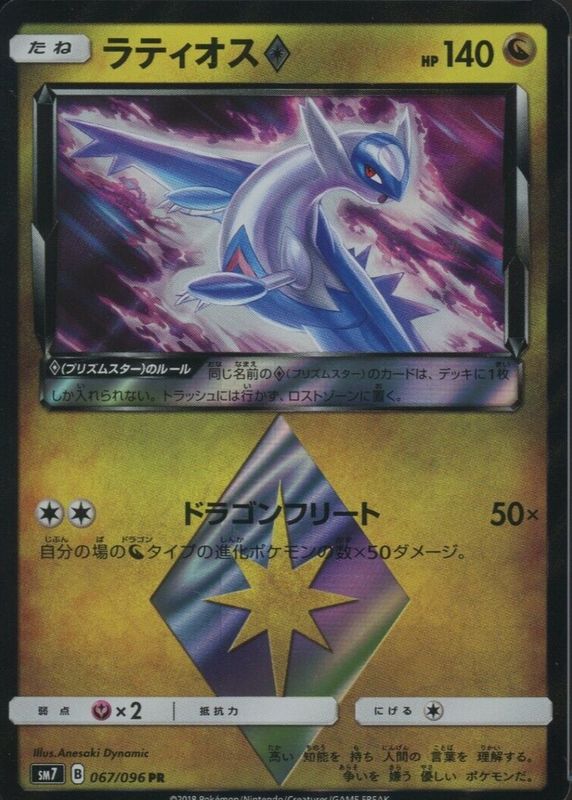 The Latios Prism Star 2018 Japanese Sun & Moon: Sky-Splitting Charisma #067/096 Holo card in Raw TCG (Near Mint) condition has moved up $0.37 (+5.6%) in the last 30 days and was last sold for $7.00 .