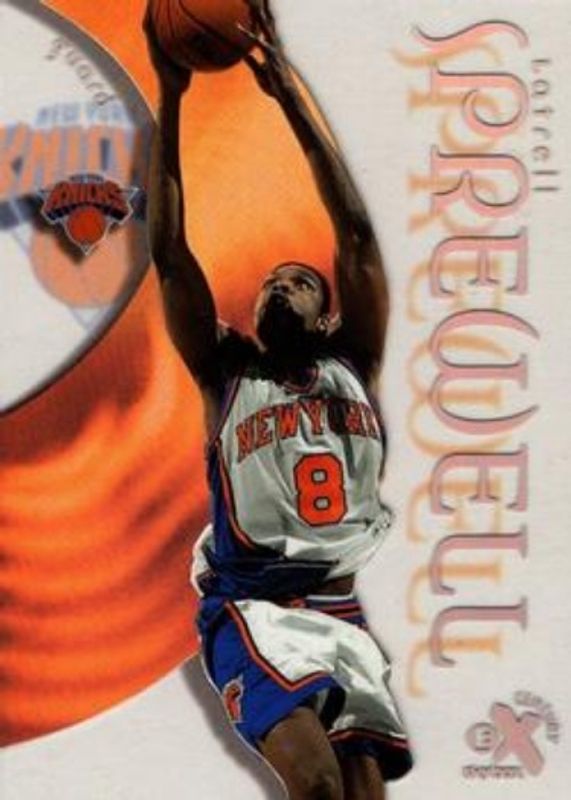 The Latrell Sprewell 1998 Skybox E-X Century #8 Base card is 1 of 3 Latrell Sprewell's card variations in the 1998 Skybox E-X Century set being tracked by Sports Card Investor, including Essential Credentials Future (/83), and Essential Credentials Now (/8).