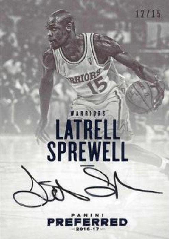 The Latrell Sprewell 2016 Preferred #128 Autographs Blue /15 card is 1 of 11 Latrell Sprewell's card variations in the 2016 Preferred set being tracked by Sports Card Investor, including #255 Base /50, #128 Base /50, #179 Base /50, #179 Crown Royale Purple /49, and #128 Autographs Purple /25.