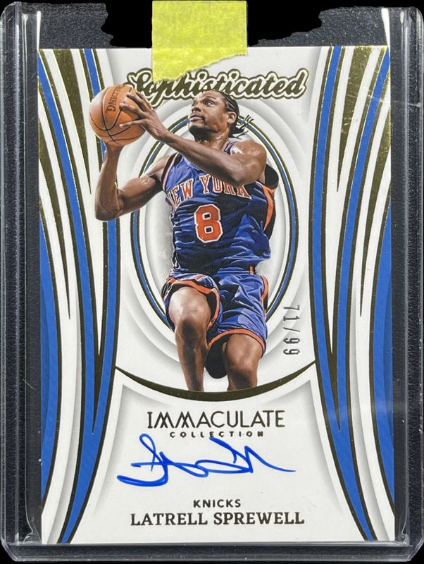 The Latrell Sprewell 2023 Immaculate #SSS-LSN Sophisticated Signatures /99 card is 1 of 10 Latrell Sprewell's card variations in the 2023 Immaculate set being tracked by Sports Card Investor, including Virtuoso Autographs /99, Sophisticated Signatures - Red /25, Virtuoso Autographs - Red /25, Sophisticated Signatures - Gold /10, and Virtuoso Autographs - Gold /10.