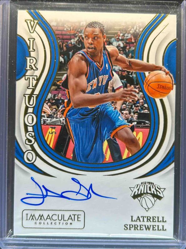 The Latrell Sprewell 2023 Immaculate #VA-LSN Virtuoso Autographs /99 card is 1 of 10 Latrell Sprewell's card variations in the 2023 Immaculate set being tracked by Sports Card Investor, including Sophisticated Signatures /99, Sophisticated Signatures - Red /25, Virtuoso Autographs - Red /25, Sophisticated Signatures - Gold /10, and Virtuoso Autographs - Gold /10.