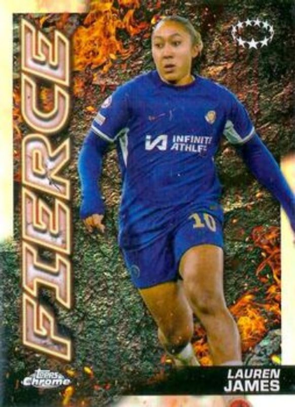 The Lauren James 2023 Topps Chrome UEFA Women's Champions League #FR-5 Fierce card is 1 of 33 Lauren James' card variations in the 2023 Topps Chrome UEFA Women's Champions League set being tracked by Sports Card Investor, including Base, Aqua Prism, Pulsar, Refractor, and XI.