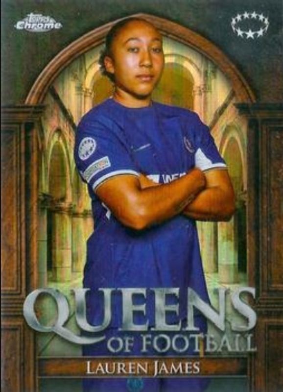 The Lauren James 2023 Topps Chrome UEFA Women's Champions League #QF-6 Queens of Football card is 1 of 33 Lauren James' card variations in the 2023 Topps Chrome UEFA Women's Champions League set being tracked by Sports Card Investor, including Base, Aqua Prism, Pulsar, Refractor, and XI.