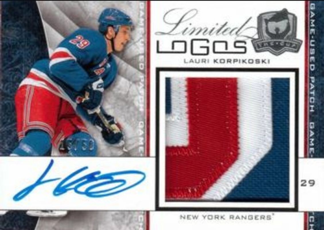 The Lauri Korpikoski 2008 Upper Deck The Cup #LL-LK Limited Logos /50 Rookie card is 1 of 45 Lauri Korpikoski's card variations in the 2008 Upper Deck The Cup set being tracked by Sports Card Investor, including Base /249, Gold Rainbow /67, Gold /25, Black /1, and Printing Plates OPC Premier Black.