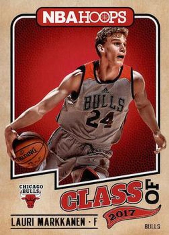 The Lauri Markkanen 2017 Hoops #7 Class of 2017 Rookie card is 1 of 29 Lauri Markkanen's card variations in the 2017 Hoops set being tracked by Sports Card Investor, including Base, Premium Factory Set /199, Blue, Faces of the Future, and Great SIGnificance.