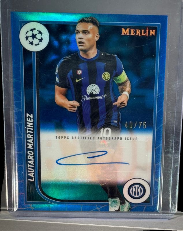 The Lautaro Martinez 2023 Topps Merlin Chrome UEFA Club Competitions #AH-LM Autographs - Blue Refractor /75 card is 1 of 45 Lautaro Martinez's card variations in the 2023 Topps Merlin Chrome UEFA Club Competitions set being tracked by Sports Card Investor, including Base, Aqua Prism Refractor, Refractor, Vintage Merlin Refractor, and Neon Green Shimmer Refractor /399.