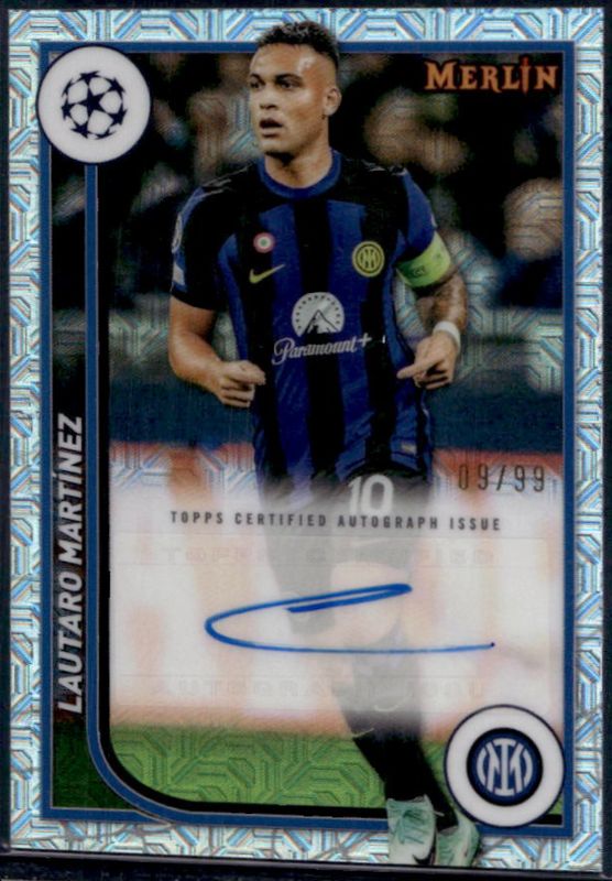 The Lautaro Martinez 2023 Topps Merlin Chrome UEFA Club Competitions #AH-LM Autographs - Mojo Refractor /99 card is 1 of 45 Lautaro Martinez's card variations in the 2023 Topps Merlin Chrome UEFA Club Competitions set being tracked by Sports Card Investor, including Base, Aqua Prism Refractor, Refractor, Vintage Merlin Refractor, and Neon Green Shimmer Refractor /399.