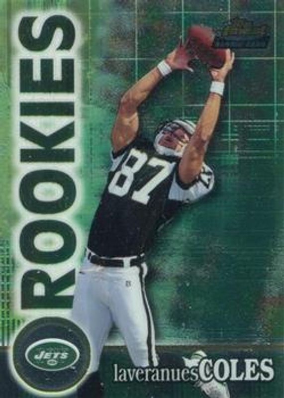 The Laveranues Coles 2000 Topps Finest #153 Base /2400 Rookie card is 1 of 2 Laveranues Coles' card variations in the 2000 Topps Finest set being tracked by Sports Card Investor, including Gold Refractor /50.