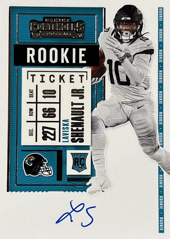 The Laviska Shenault Jr. 2020 Contenders #117 Rookie Ticket Auto Variation card in Raw condition has not changed in price in the last 30 days and was last sold for $9.95 .