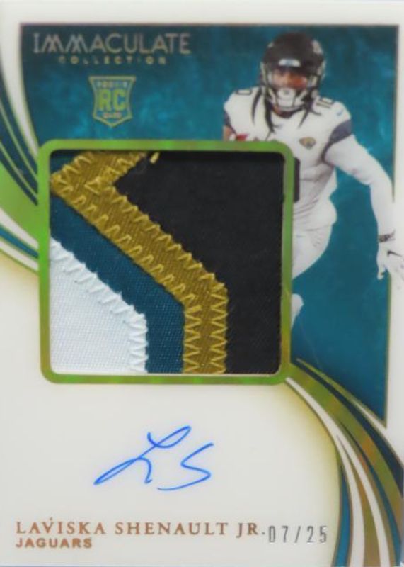 The Laviska Shenault Jr. 2020 Immaculate #PPR-LSH Premium Patch Rookie Autographs - Gold /25 card in Raw condition has not changed in price in the last 30 days and was last sold for $10.50 .