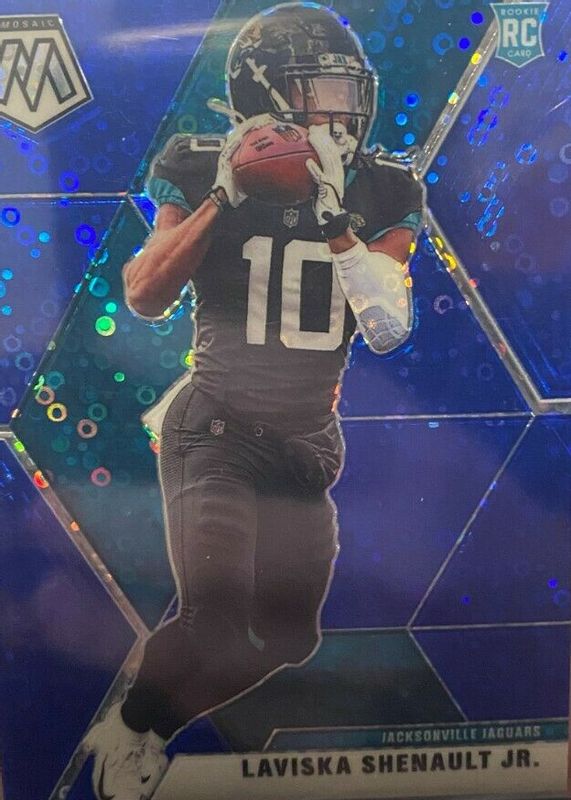 The Laviska Shenault Jr. 2020 Mosaic #217 No Huddle Blue /75 Rookie card in Raw condition has not changed in price in the last 30 days and was last sold for $22.50 .