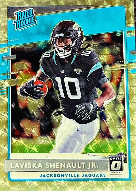 The Laviska Shenault Jr. 2020 Optic #168 Gold Vinyl /1 Rookie card in Raw condition has not changed in price in the last 30 days and was last sold for $50.00 .