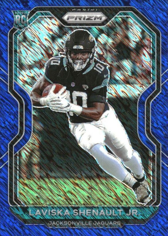 The Laviska Shenault Jr. 2020 Prizm #350 FOTL Blue Shimmer /25 Rookie card in Raw condition has not changed in price in the last 30 days and was last sold for $5.50 .