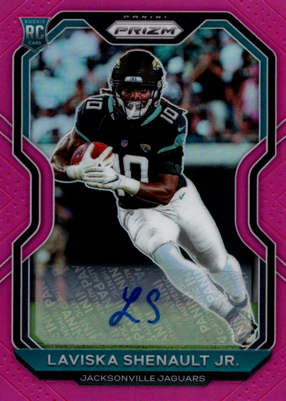 The Laviska Shenault Jr. 2020 Prizm #350 Rookie Autographs - Pink card in Raw condition has not changed in price in the last 30 days and was last sold for $2.69 .
