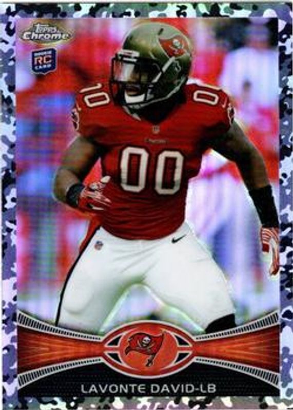 The Lavonte David 2012 Topps Chrome #198 Camo Refractor /499 Rookie card is 1 of 19 Lavonte David's card variations in the 2012 Topps Chrome set being tracked by Sports Card Investor, including Base, Blue Wave Refractor, Orange Refractor, Refractor, and X-Fractor.