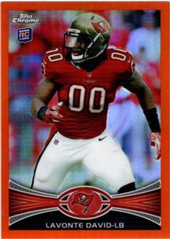The Lavonte David 2012 Topps Chrome #198 Orange Refractor Rookie card is 1 of 19 Lavonte David's card variations in the 2012 Topps Chrome set being tracked by Sports Card Investor, including Base, Blue Wave Refractor, Refractor, X-Fractor, and Camo Refractor /499.