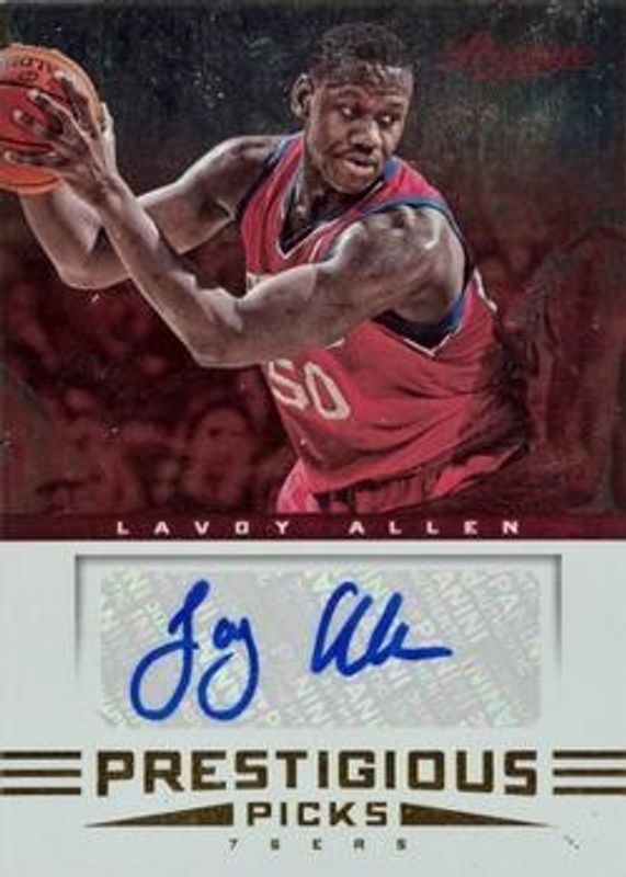 The Lavoy Allen 2012 Prestige #42 Prestigious Picks Signatures Rookie card is 1 of 4 Lavoy Allen's card variations in the 2012 Prestige set being tracked by Sports Card Investor, including Base, Bonus Shots Gold /249, and Bonus Shots Black /10.