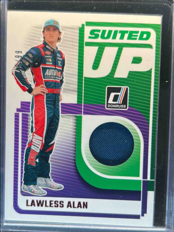 The Lawless Alan 2025 Donruss NASCAR #SU-LAN Suited Up Swatches - Red /99 card is 1 of 51 Lawless Alan's card variations in the 2025 Donruss NASCAR set being tracked by Sports Card Investor, including Base, Laser, Red /299, Blue /199, and Lime Green /199.