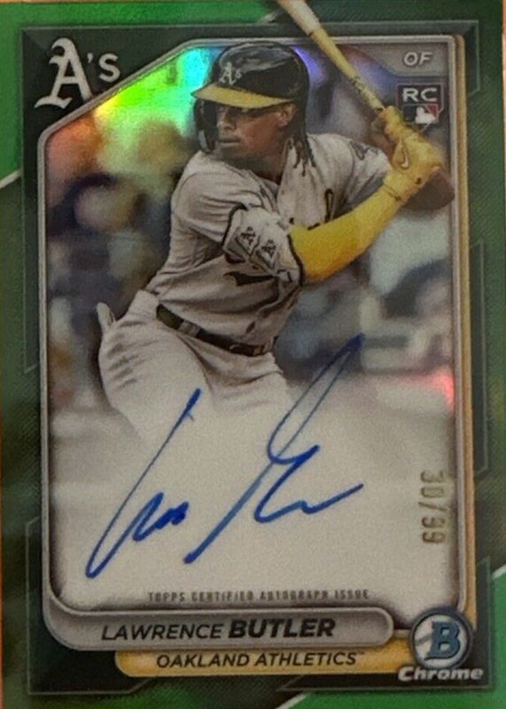 This card is 1 of 10 Lawrence Butler's card variations in the 2024 Bowman set being tracked by Sports Card Investor, including Chrome Rookie Auto - Refractor /499, Chrome Rookie Auto - Blue Refractor /150, Chrome Rookie Auto - Mini-Diamond Refractor /100, Chrome Rookie Auto - Green Refractor /99, and Chrome Rookie Auto - Yellow Refractor /75.