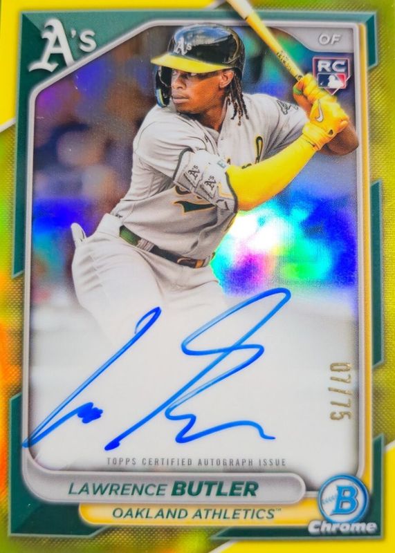 The Lawrence Butler 2024 Bowman #CRA-LB Chrome Rookie Auto - Yellow Refractor /75 card in Raw condition has not changed in price in the last 30 days and was last sold for $62.00 .