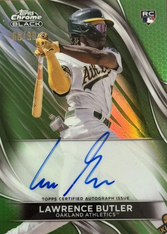 This card is 1 of 8 Lawrence Butler's card variations in the 2024 Topps Chrome Black set being tracked by Sports Card Investor, including Autographs, Autographs - Refractor /150, Autographs - Gold Mini-Diamond Refractor /50, Autographs - Gold Refractor /50, and Autographs - Orange Refractor /25.