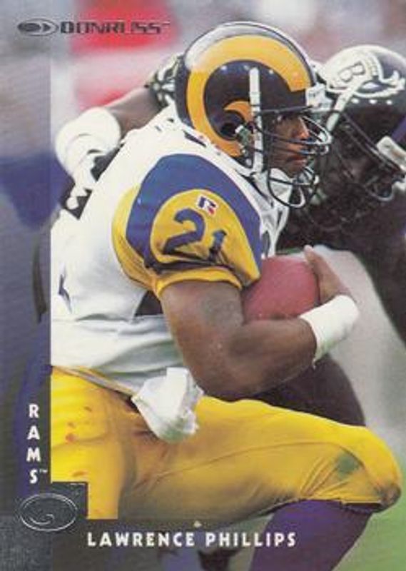The Lawrence Phillips 1997 Donruss #22 Base card is 1 of 3 Lawrence Phillips' card variations in the 1997 Donruss set being tracked by Sports Card Investor, including Press Proof Gold Die-Cut, and Press Proof Silver.