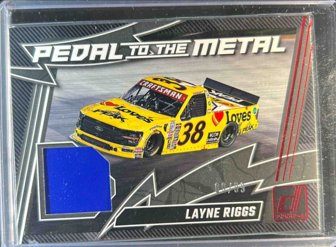 The Layne Riggs 2025 Donruss NASCAR #PM-LRG Pedal to the Metal Materials - Red /99 card is 1 of 53 Layne Riggs' card variations in the 2025 Donruss NASCAR set being tracked by Sports Card Investor, including Base, Laser, Red /299, Blue /199, and Lime Green /199.