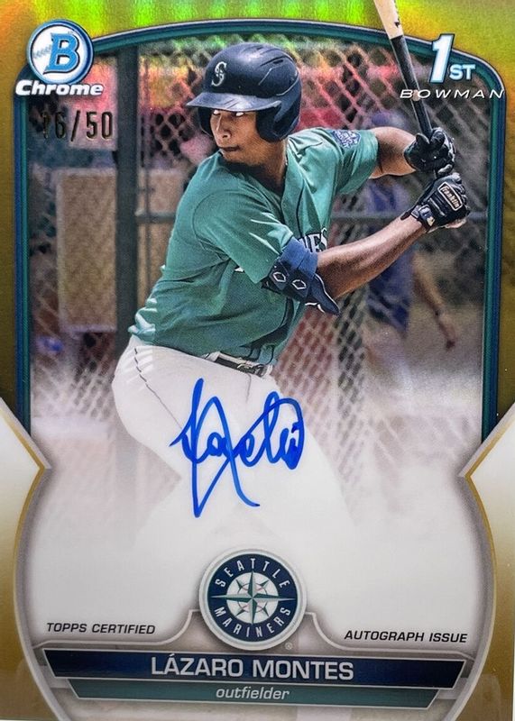 The Lazaro Montes 2023 Bowman #CPA-LM Chrome Prospect Auto - Gold Refractor /50 (1st) card in Raw condition has not changed in price in the last 30 days and was last sold for $1,526.00 .