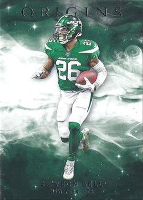 The Le'Veon Bell 2019 Origins #67 Base card is 1 of 13 Le'Veon Bell's card variations in the 2019 Origins set being tracked by Sports Card Investor, including Red /299, Orange /175, Blue /99, Turquoise /25, and FOTL Purple /13.
