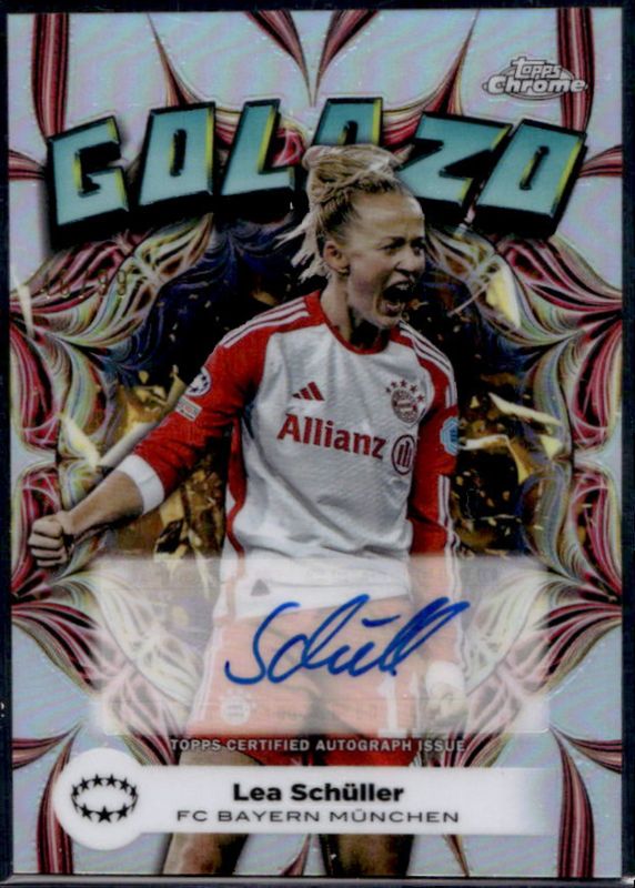 The Lea Schuller 2023 Topps Chrome UEFA Women's Champions League #GA-LS Golazo Autographs card is 1 of 30 Lea Schuller's card variations in the 2023 Topps Chrome UEFA Women's Champions League set being tracked by Sports Card Investor, including Base, Aqua Prism, Pulsar, Refractor, and XI.