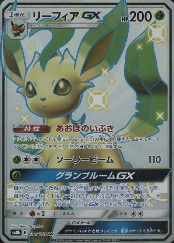 The Leafeon GX 2018 Japanese Sun & Moon: GX Ultra Shiny #206/150 Shiny Super-Rare (Full Art) card in Raw TCG (Near Mint) condition has not changed in price in the last 30 days and was last sold for $50.00 .