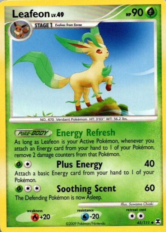 The Leafeon 2009 Platinum: Rising Rivals #045/111 Base card in Raw TCG (Lightly Played) condition has moved down -$1.15 (-40.1%) in the last 30 days and was last sold for $1.71 .
