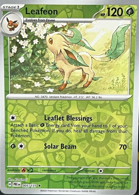 The Leafeon 2025 Scarlet & Violet: Prismatic Evolutions #005/131 Reverse Holo card in Raw TCG (Near Mint) condition has moved down -$0.68 (-31.9%) in the last 30 days and was last sold for $1.45 .