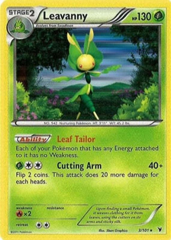 This card is 1 of 3 Leavanny's card variations in the 2011 Black & White: Noble Victories set being tracked by Sports Card Investor, including Reverse Holo, and Promo (Fast Daze Theme Deck).