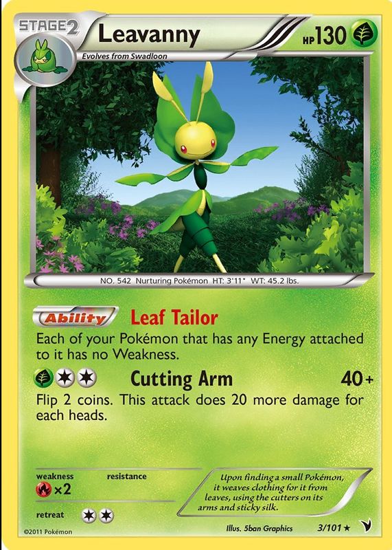 This card is 1 of 3 Leavanny's card variations in the 2011 Black & White: Noble Victories set being tracked by Sports Card Investor, including Holo, and Promo (Fast Daze Theme Deck).