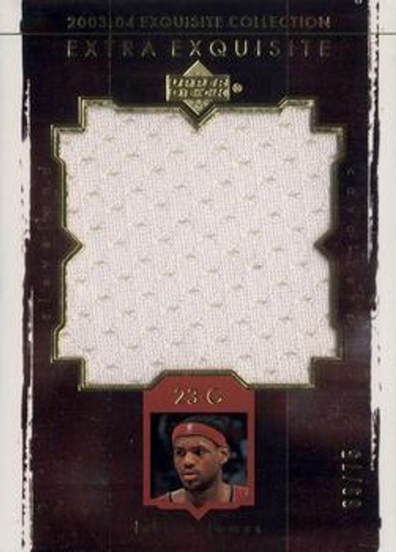 The LeBron James 2003 Upper Deck Exquisite Collection #EE-LJ1 Extra Exquisite /75 Rookie card is 1 of 19 LeBron James' card variations in the 2003 Upper Deck Exquisite Collection set being tracked by Sports Card Investor, including Base /225, Gold /25, Rainbow /1, Number Pieces Patch Autographs (/23), and Rookie Patch Auto (/99).