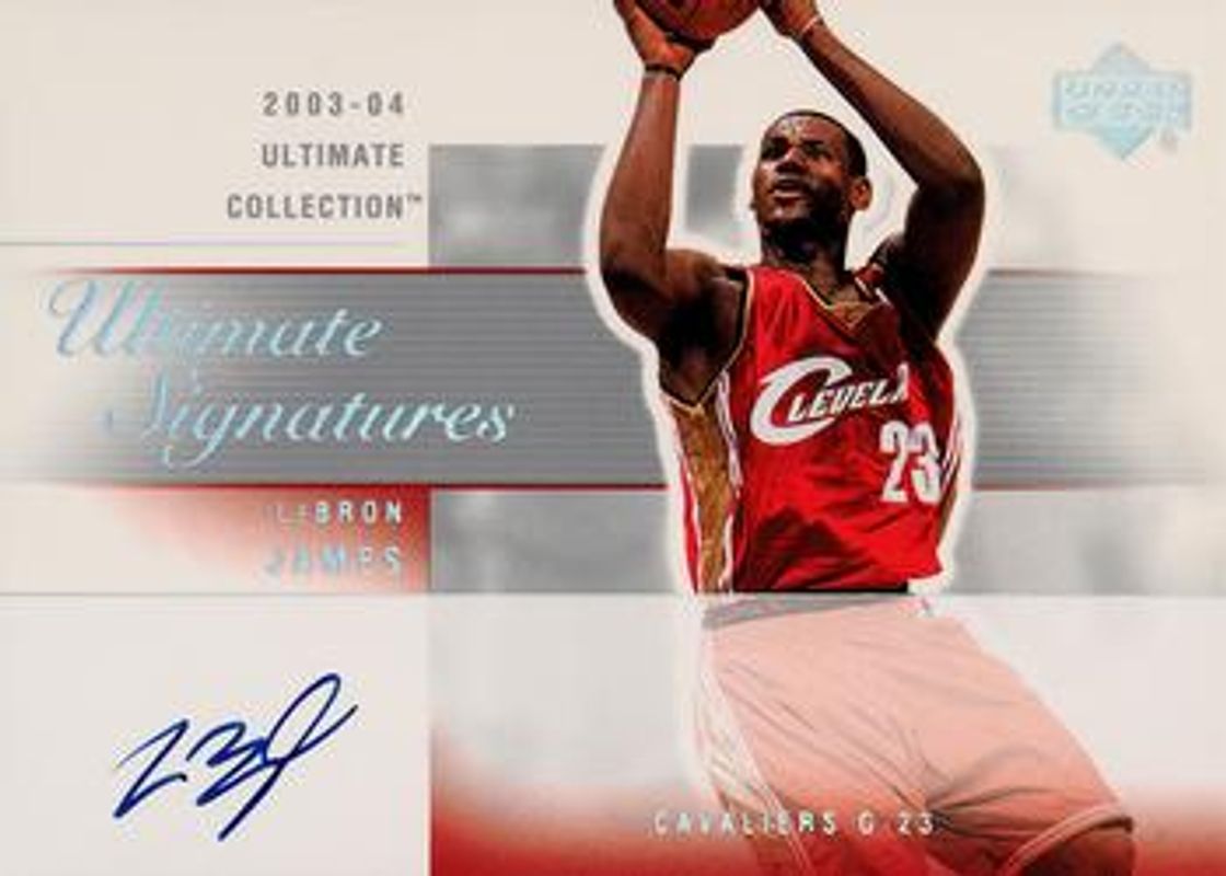 The LeBron James 2003 Upper Deck Ultimate Collection #LJ-A Signatures Rookie card is 1 of 24 LeBron James' card variations in the 2003 Upper Deck Ultimate Collection set being tracked by Sports Card Investor, including Base /750, Limited /25, Limited Black /1, Ultimate Signatures, and Ultimate Rookie Autographs /250.