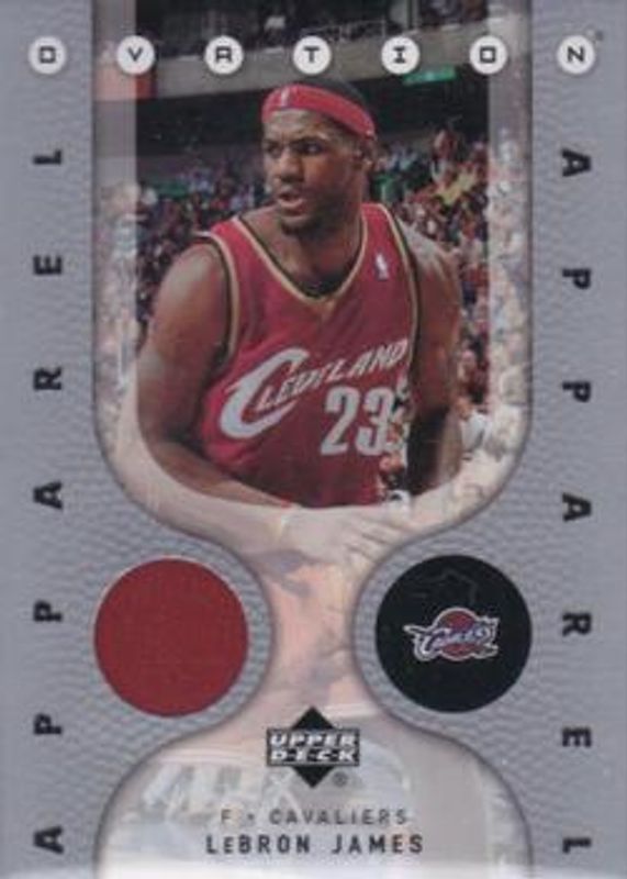 The LeBron James 2006 Upper Deck Ovation #OA-LJ Apparel card is 1 of 8 LeBron James' card variations in the 2006 Upper Deck Ovation set being tracked by Sports Card Investor, including Base /999, Gold /99, Leading Performers, Spotlight Signatures, and Superstar Theatre.
