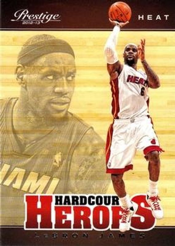 The LeBron James 2012 Prestige #5 Hardcourt Heroes card is 1 of 17 LeBron James' card variations in the 2012 Prestige set being tracked by Sports Card Investor, including Base, Bonus Shots Gold /249, Bonus Shots Black /10, All Stars East, and Connections.