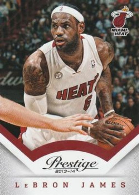 The LeBron James 2013 Prestige #39 Base card is 1 of 15 LeBron James' card variations in the 2013 Prestige set being tracked by Sports Card Investor, including Bonus Shots Blue, Bonus Shots Red, Bonus Shots Silver, Bonus Shots Gold /10, and Bonus Shots Green /5.