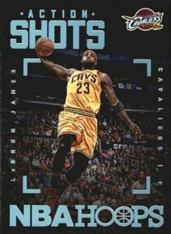 The LeBron James 2015 Hoops #12 Action Shots card is 1 of 38 LeBron James' card variations in the 2015 Hoops set being tracked by Sports Card Investor, including Base, Gold, Green, Red Back, and Blue /399.